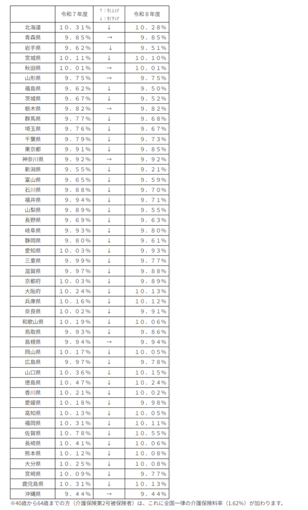 健康保険料率が都道府県ごとに決定されるのに対し、介護保険料率は全国一律で同じ料率が適用される仕組みです。令和8年3月分からは「1.62%」が適用されることとなり、従前の「1.59%」から引き上げとなりました。