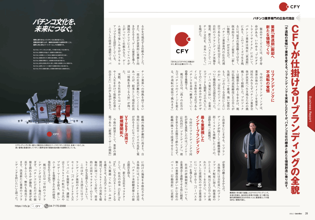 CFY社は、パチンコ業界専門の広告代理店として、業界の「衰退期」を打破し、未来へと繋ぐためのリブランディングを開始しました。構想に1年をかけ、2025年12月に「パチンコ文化を、未来へつなぐ。」という新たなパーパス(企業理念)を発表しました。